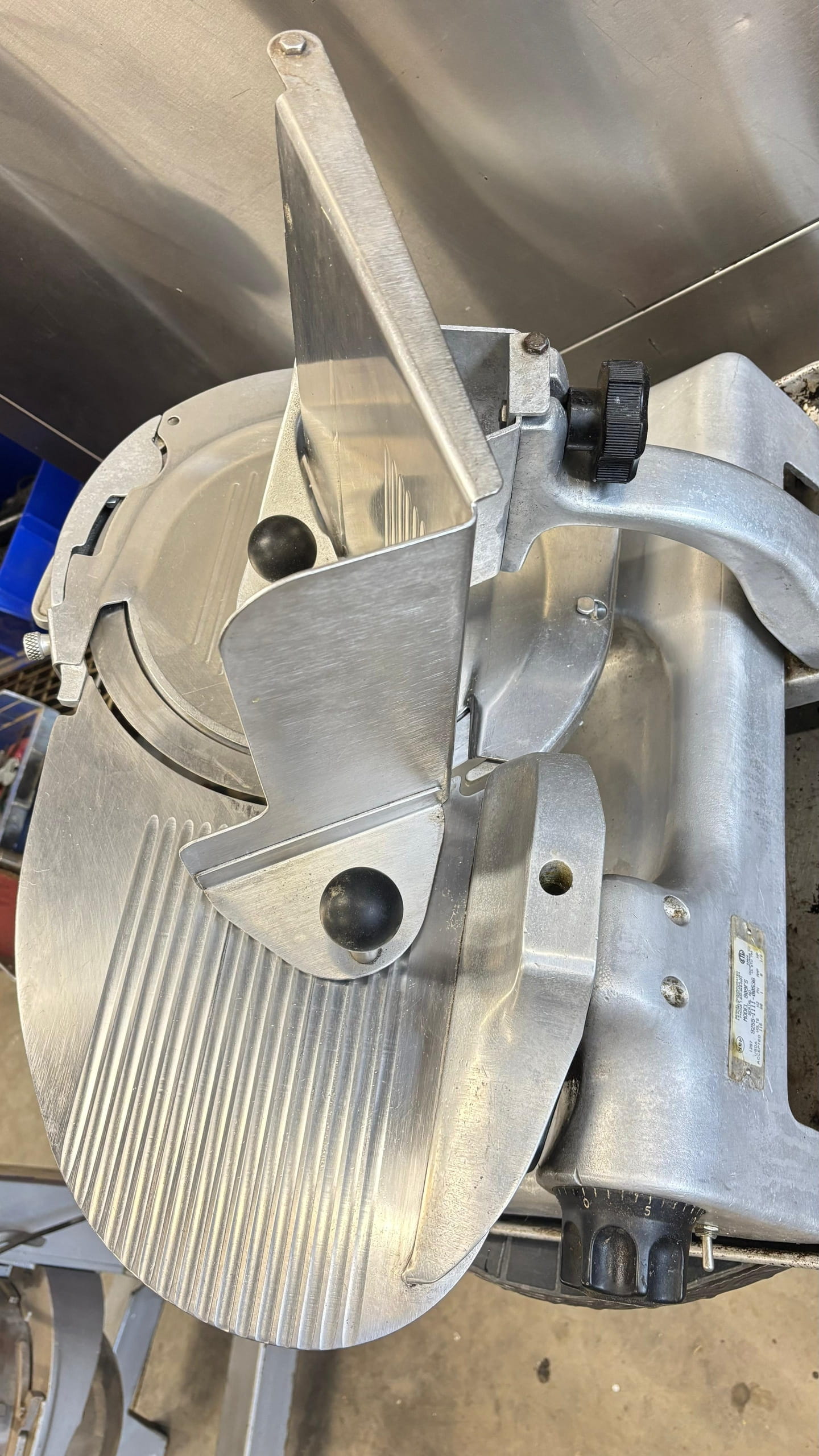Commercial meat and deli slicer designed for cutting meat, cheese, and vegetables evenly. Ideal for restaurants, butcher shops, and delis.