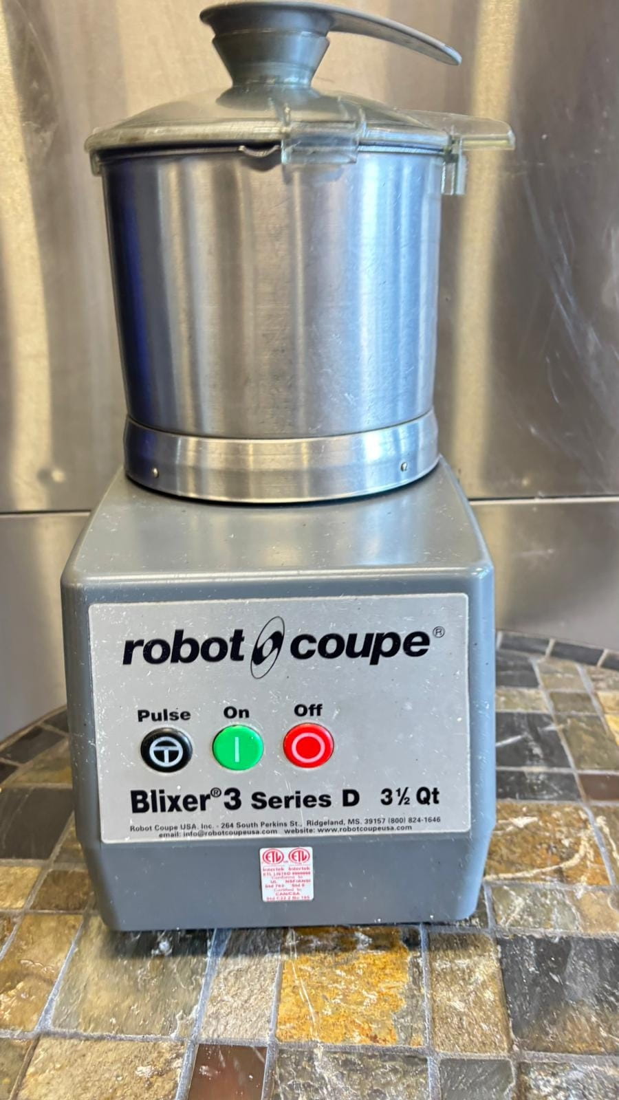Combination blender and food processor designed for mixing, pureeing, and preparing smooth food textures. Suitable for restaurants and healthcare kitchens.